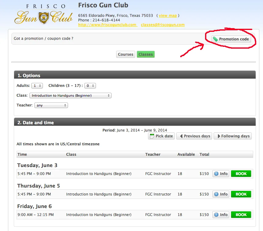 Using an OFFER Code on the Bookeo Classes/Training registration site is very easy. Once you select the class you want to take, simply click on the Promotion Code button at the top right of the screen as seen below:
